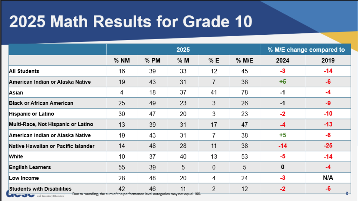 In grade 10 math, the state went from almost 60% in 2019; now 45%.