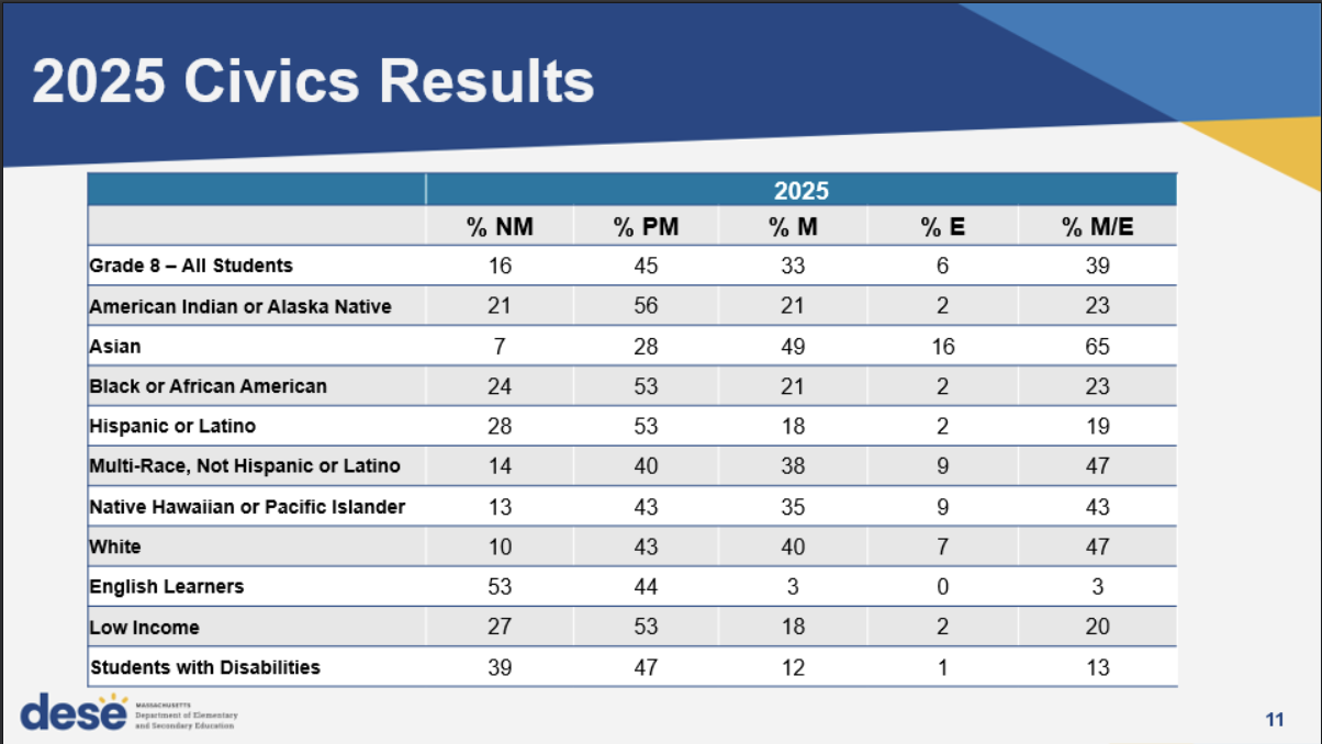 There are “remarkably consistent” results of around 42 percent meeting or exceeding the standard, with also consistent results of around 20 percent not meeting. In looking at the subgroup data, Martinez said that he had not seen proficiency levels this low for multilingual students; he was concerned that Massachusetts had only recently had changes allowing for best practices for multilingual students. We are behind much of the country on those practices.